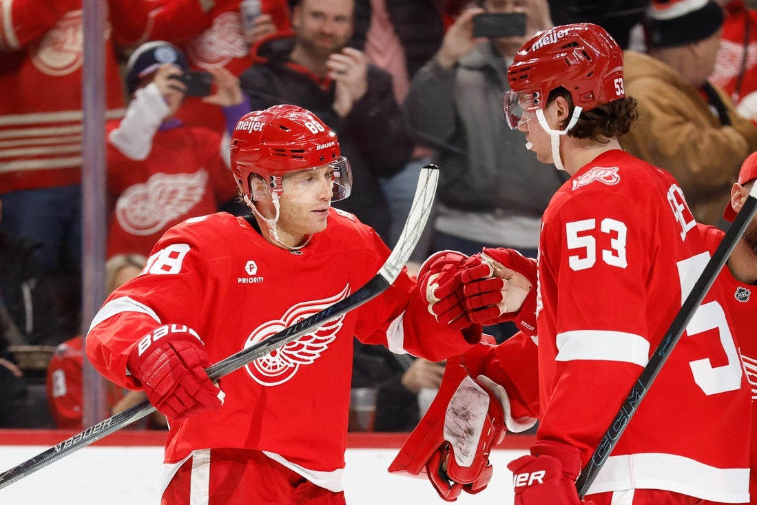 Jan 29, 2026; Detroit, Michigan, USA; Detroit Red Wings right wing Patrick Kane (88) receives congratulations from teammates after he gets his 1375 point in the second period against the Washington Capitals at Little Caesars Arena. Mandatory Credit: Rick Osentoski-Imagn Images Nic Dowd scored the decisive goal in the shootout and also tallied in regulation as the visiting Washington Capitals overcame Patrick Kane’s history-making point and two late goals by Alex DeBrincat to defeat the Detroit Red Wings 4-3 on Thursday.