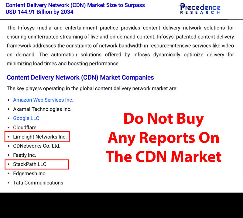 The worst offenders are reports authored and sold by Precedence Research, Grand View Research, Fortune Business Insights, Fact MR, SkyQuest, Avania, IMARC Research, Future Market Insights and Roots Analysis, among others. Many of these reports also misspell vendor names (Cloudfare, Lemelight) or suggest that Verizon is an “emerging market participant” and that Fastly is a “new startup.” The average cost for these reports is $5k, with some costing twice that. Most have no author listed, and those that do list an author also cover markets tied to pharma and automotive. These authors have no understanding of the CDN market.