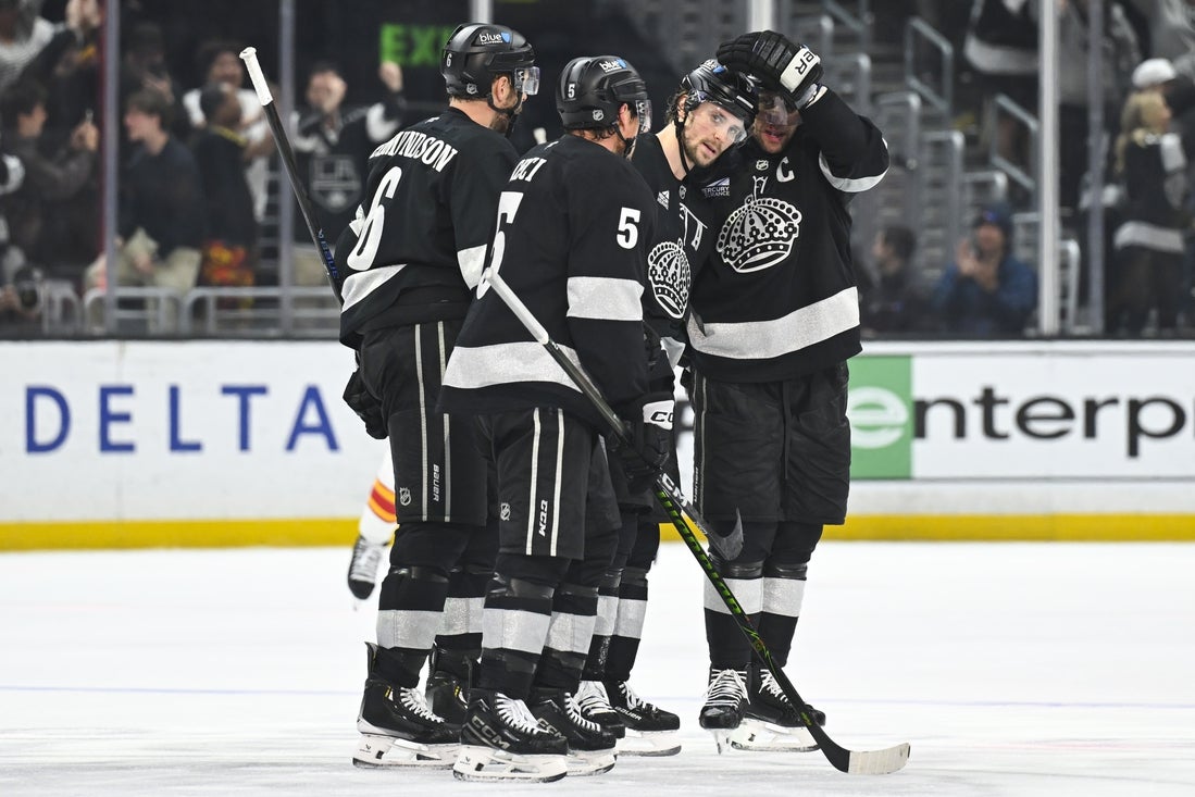 Feb 28, 2026; Los Angeles, California, USA; Los Angeles Kings celebrate after the goal scored by Los Angeles Kings right wing Adrian Kempe (9) during the third period against the Calgary Flames at Crypto.com Arena. Mandatory Credit: Griffin Hooper-Imagn Images The Los Angeles Kings will have a new coach behind the bench when they host the Colorado Avalanche on Monday night.