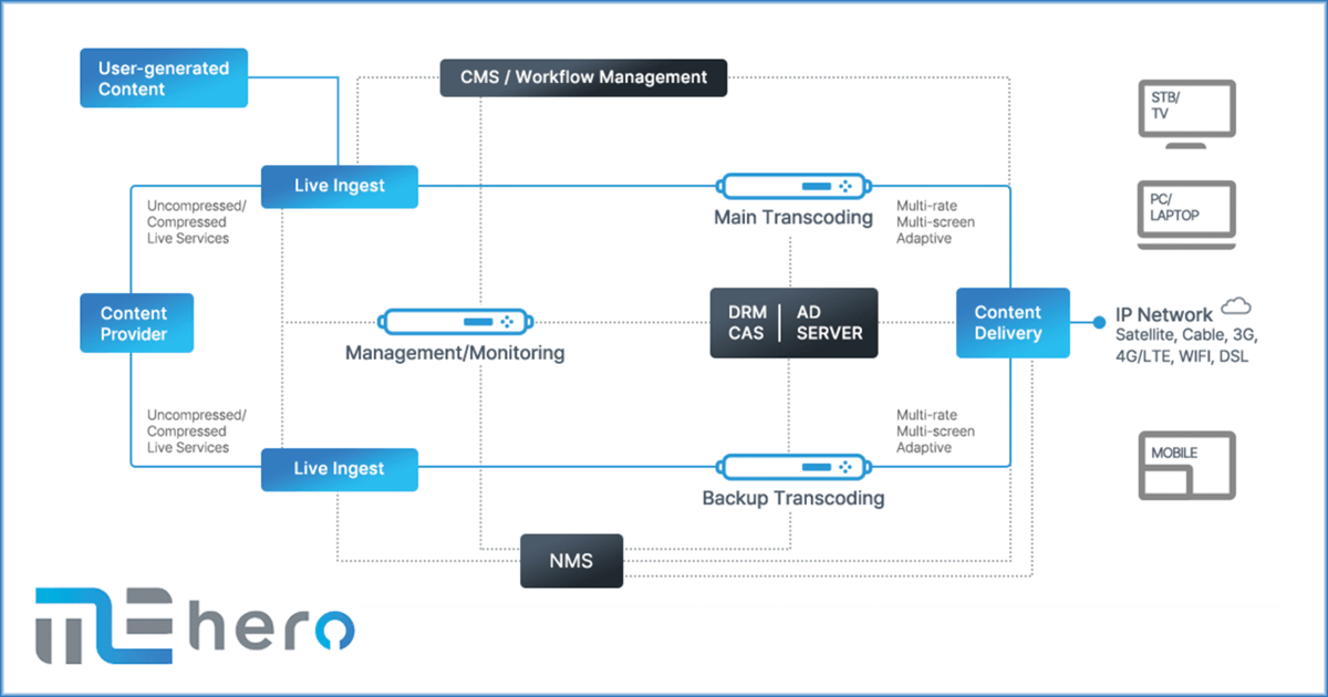 The platform provides synchronized outputs from multiple camera inputs and ad insertion workflows. HERO supports real-time HEVC compression up to UHD/4K60p and 8K with HDR for on-prem, virtual, and cloud architectures. The platform powers the most high- profile services worldwide, including AT&T, Verizon, Disney, CNN, the UFC, the NFL, the NBA, MTV, FIFA, ESPN, Lockheed Martin, Level3, LG, Encompass, Akamai, QVC, and many more.