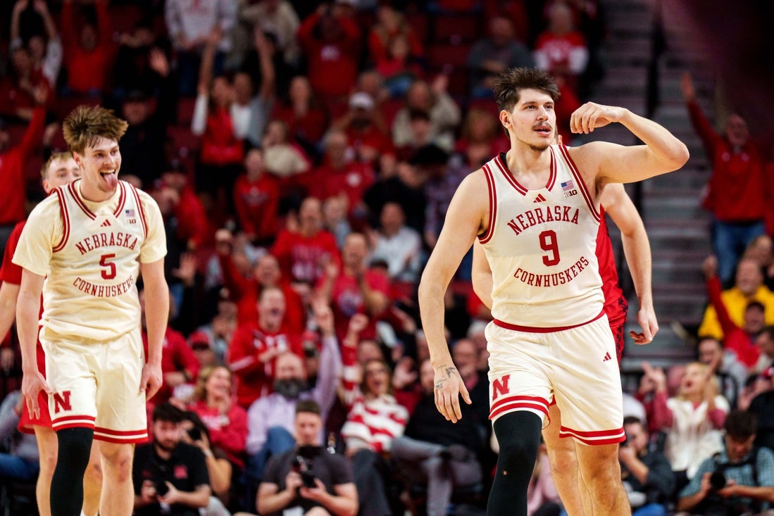 Dec 10, 2025; Lincoln, Nebraska, USA; Nebraska Cornhuskers forward Berke Buyuktuncel (9) reacts after a basket against the Wisconsin Badgers during the second half at Pinnacle Bank Arena. Mandatory Credit: Dylan Widger-Imagn Images Rienk Mast registered his third double-double of the season and No. 23 Nebraska matched multiple school-record win streaks in a 90-60 victory over Wisconsin in a Big Ten Conference game on Wednesday in Lincoln, Neb.